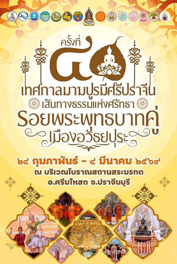ททท สำนักงานนครนายก (นครนายก-ปราจีนบุรี-สระแก้ว) เชิญร่วมงาน เทศกาลมาฆปูรมีศรีปราจีน ครั้งที่ 40 เส้นทางธรรมแห่งศรัทธา รอยพระพุทธบาทคู่ เมืองอวัธยปุระ ณ โบราณสถานสระมรกต อำเภอศรีมโหสถ จังหวัดปราจีนบุรี วันที่ 24 กุมภาพันธ์ – 4 มีนาคม 2569