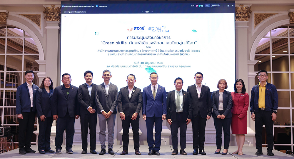 สำนักงานสภานโยบายการอุดมศึกษา วิทยาศาสตร์ วิจัยและนวัตกรรมแห่งชาติ (สอวช.) ร่วมกับ สำนักงานพัฒนาวิทยาศาสตร์และเทคโนโลยีแห่งชาติ (สวทช.) จัดการประชุมเสวนาวิชาการ “Green skills : ทักษะสีเขียวพลิกอนาคตไทยสู่เวทีโลก” เมื่อวันที่ 30 มิถุนายน 2568 ณ ห้องประชุมแมนดารินซี ชั้น 1 โรงแรมแมนดาริน สามย่าน กรุงเทพฯ โดยมี ดร.สุรชัย สถิตคุณรัตน์ ผู้อำนวยการ สอวช. กล่าวเปิดงาน