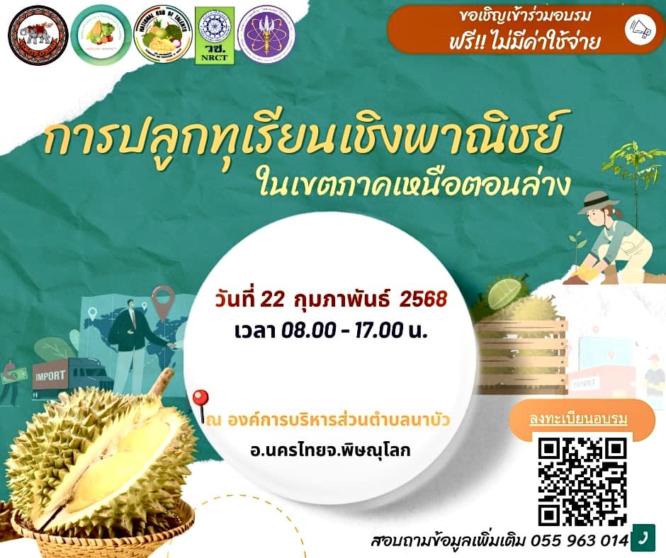 ขอเชิญเข้าร่วมอบรม เรื่อง “การปลูกทุเรียนเชิงพาณิชย์ในเขตภาคเหนือตอนล่าง” วันเสาร์ที่ 22 กุมภาพันธ์ 2568 เวลา 08.00 – 17.00 น. ณ องค์การบริหารส่วนตำบลนาบัว อำเภอนครไทย จังหวัดพิษณุโลก