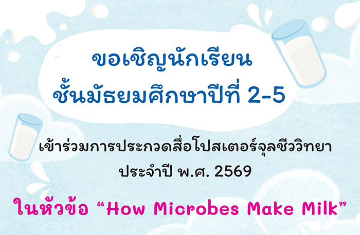 สถาบันส่งเสริมการสอนวิทยาศาสตร์และเทคโนโลยี (สสวท.) ร่วมกับ Microbiology in Schools Advisory Committee (MiSAC, สหราชอาณาจักร) ขอเชิญนักเรียนระดับมัธยมศึกษาปีที่ 2–5 ส่งผลงานเข้าร่วมการประกวดสื่อโปสเตอร์จุลชีววิทยา ประจำปี พ.ศ. 2569 ในหัวข้อ “บทบาทของจุลินทรีย์ในการช่วยสร้างน้ำนมวัว How Microbes Make Milk” เพื่อส่งเสริมความรู้ความเข้าใจเกี่ยวกับบทบาทของจุลินทรีย์ในกระบวนการสร้างน้ำนม สร้างแรงบันดาลใจด้านวิทยาศาสตร์และเทคโนโลยี และตระหนักถึงความสำคัญของเกษตร โภชนาการ และการพัฒนาที่ยั่งยืน ผู้ชนะเลิศจะได้รับเงินรางวัล และผู้เข้าร่วมประกวดทุกคนจะได้รับเกียรติบัตร เปิดรับสมัครและส่งผลงานได้ตั้งแต่วันที่ 16 มกราคม – 3 เมษายน 2569 ที่ https://forms.gle/c4n4YxUijrHiRyMb9 ดูรายละเอียดเพิ่มเติมที่ https://www.ipst.ac.th/microbecontest สอบถามข้อมูลเพิ่มเติมได้ที่ wrata@ipst.ac.th