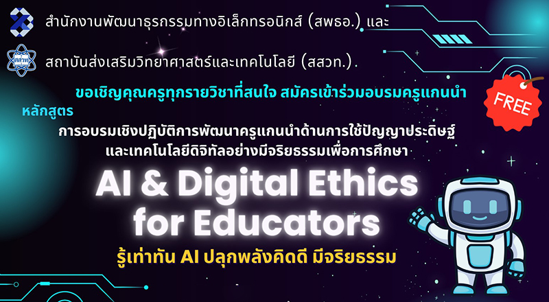 สถาบันส่งเสริมการสอนวิทยาศาสตร์และเทคโนโลยี (สสวท.) ร่วมกับสำนักงานพัฒนาธุรกรรมทางอิเล็กทรอนิกส์ (สพธอ.) ขอเชิญครูทุกกลุ่มสาระสมัครเข้าร่วมอบรมครูแกนนำ หลักสูตร การอบรมเชิงปฏิบัติการพัฒนาครูแกนนำด้านการใช้ปัญญาประดิษฐ์และเทคโนโลยีดิจิทัลอย่างมีจริยธรรมเพื่อการศึกษา (AI & Digital Ethics for Educators : รู้เท่าทัน AI ปลุกพลังความคิดดี มีจริยธรรม) เพื่อเสริมความเข้าใจด้านการใช้ปัญญาประดิษฐ์อย่างเหมาะสม ปลอดภัยและมีจริยธรรม พร้อมส่งเสริมให้นักเรียนรู้เท่าทันการใช้ AI อย่างถูกต้อง