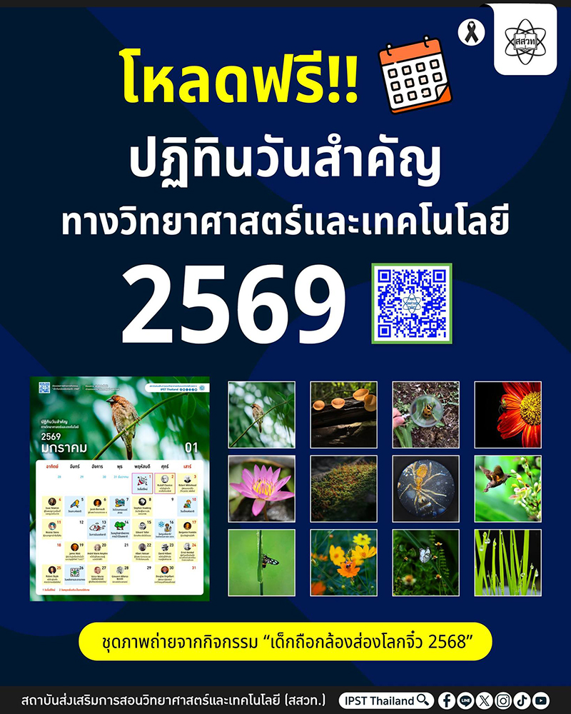 ต้อนรับปีใหม่ 2569 สถาบันส่งเสริมการสอนวิทยาศาสตร์และเทคโนโลยี (สสวท.) โดยเพจเฟซบุ๊ก IPST Thailand มอบของขวัญปีใหม่พิเศษแด่ครู นักเรียน และประชาชนทั่วไป ด้วยการเปิดให้ดาวน์โหลดฟรี “ปฏิทินวันสำคัญทางวิทยาศาสตร์และเทคโนโลยี ประจำปี 2569” ปฏิทินปีนี้มาในธีมภาพถ่ายจากกิจกรรม “เด็กถือกล้องส่องโลกจิ๋ว” ถ่ายทอดการเรียนรู้วิทยาศาสตร์ผ่านมุมมองของเด็ก ๆ พร้อมรวบรวมวันสำคัญและเรื่องราวน่ารู้ทางวิทยาศาสตร์และเทคโนโลยี ที่ช่วยส่งเสริมการเรียนรู้ สร้างแรงบันดาลใจ ต่อยอดการนำไปใช้ในห้องเรียนและชีวิตประจำวันตลอดทั้งปี รวมถึงใช้เป็นสื่อสนับสนุนการจัดการเรียนรู้และกิจกรรมทางการศึกษา ดาวน์โหลดและส่งต่อได้ฟรี จากเว็บไซต์ สสวท. คลิกที่ https://www.ipst.ac.th/ipst-calendar-2026