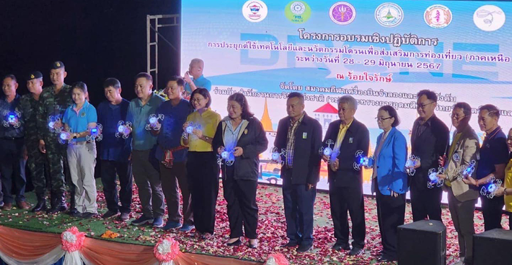 สำนักงานการวิจัยแห่งชาติ (วช.) กระทรวงการอุดมศึกษา วิทยาศาสตร์ วิจัยและนวัตกรรม โดย ดร.วิภารัตน์ ดีอ่อง ผู้อำนวยการสำนักงานการวิจัยแห่งชาติ เป็นประธานในพิธีเปิดการอบรมเชิงปฏิบัติการ และกิจกรรมส่งเสริมการท่องเที่ยวภาคพื้นที่ “โดรนแปรอักษรเพื่อการส่งเสริมการท่องเที่ยว” ณ โครงการร้อยใจรักษ์ จังหวัดเชียงใหม่ และพื้นที่อำเภอแม่อาย จังหวัดเชียงใหม่ เมื่อวันที่ 28 มิถุนายน 2567 พร้อมนี้ คุณสลีลญา คำภาแก้ว นายอำเภอแม่อาย จังหวัดเชียงใหม่ ให้การต้อนรับ ร่วมกับ พ.ต.อ. ศันย์ชัย พาณิชกุล ผกก.สภ.แม่อาย, คุณบุญโรจน์ กองแก้ว นายกองค์การบริหารส่วนตำบลท่าตอน แม่อาย จ.เชียงใหม่, คุณสมรส พรหมมินทร์ โครงการร้อยใจรักษ์ ผู้บริหารส่วนท้องถิ่นและภาคประชาชนในพื้นที่ โดยมี คุณพิศิษฐ์ มิตรเกื้อกูล สมาคมกีฬาเครื่องบินจำลองและวิทยุบังคับ นำความเชี่ยวชาญด้านเทคโนโลยีปัญญาประดิษฐ์ ถ่ายทอดความรู้แก่กลุ่มเป้าหมายและนำเสนอโดรนแปรอักษร เพื่อส่งเสริมการท่องเที่ยวและสร้างโอกาสใหม่ในการทำงานด้านการท่องเที่ยวในพื้นที่