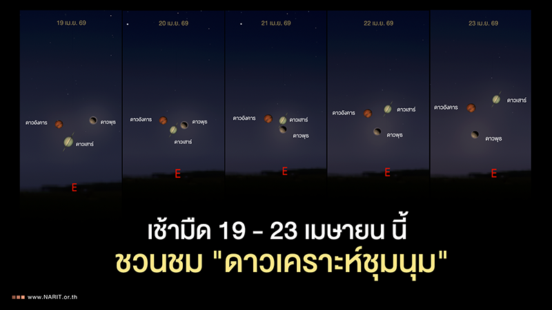 ทั้งนี้ สามารถสังเกตดาวเคราะห์ทั้ง 3 ดวง ปรากฏใกล้กันในช่วงเช้ามืด จนถึงวันที่ 23 เมษายน 2569 ตลอดทั้ง 5 วันนี้ เริ่มสังเกตปรากฏการณ์ได้ทางทิศตะวันออก ตั้งแต่เวลาประมาณ 05:00 น. จนถึงรุ่งเช้า