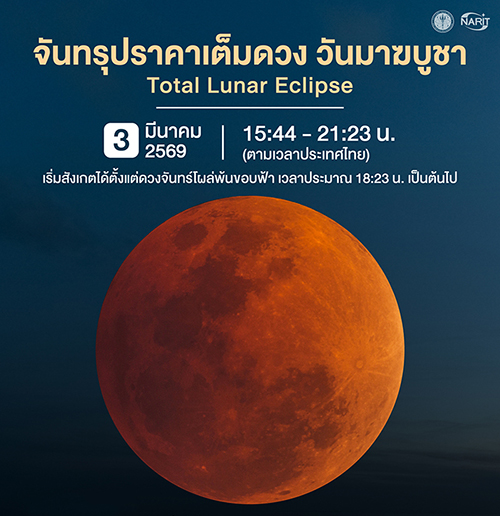 สถาบันวิจัยดาราศาสตร์แห่งชาติ (องค์การมหาชน) (สดร.) หรือ NARIT กระทรวงการอุดมศึกษา วิทยาศาสตร์ วิจัย และนวัตกรรม (อว.) เผยว่า วันที่ 3 มีนาคม 2569 ตรงกับวันมาฆบูชา จะเกิดปรากฏการณ์ “จันทรุปราคาเต็มดวง” เวลาประมาณ 15:44 – 21:23 น. (ตามเวลาประเทศไทย ณ กรุงเทพมหานคร) ในไทยเริ่มสังเกตได้ด้วยตาเปล่าตั้งแต่ดวงจันทร์โผล่พ้นขอบฟ้า เวลาประมาณ 18:23 น. เป็นต้นไป ตรงช่วงคราสเต็มดวงพอดี ดวงจันทร์เต็มดวงจะปรากฏเป็นสีแดงอิฐ จนถึงเวลาประมาณ 19:02 น. นาน 39 นาที หลังจากนั้นก็ยังติดตามชมได้จนสิ้นสุดปรากฏการณ์